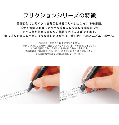 「フリクションインキ」には消色温度が設定されているため、筆跡をボディ後部の専用ラバーで擦ることで生じる摩擦熱によりインキの色が無色に変わり、筆跡を消すことができます。